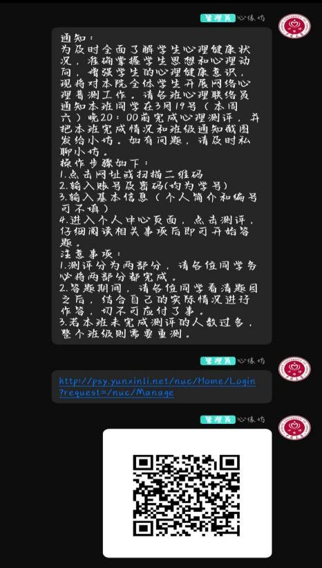 此次心理普测以班级为单位,通过网上开展心理测评的方式展开。为保证本次心理普测的正常进行,事先将测评流程以及注意事项在心理联络员群内进行了详细的说明。同时对测评过程中同学们所遇到的问题采取相应的解决措施。自此,网上心理测评工作于3月20日落下帷幕。