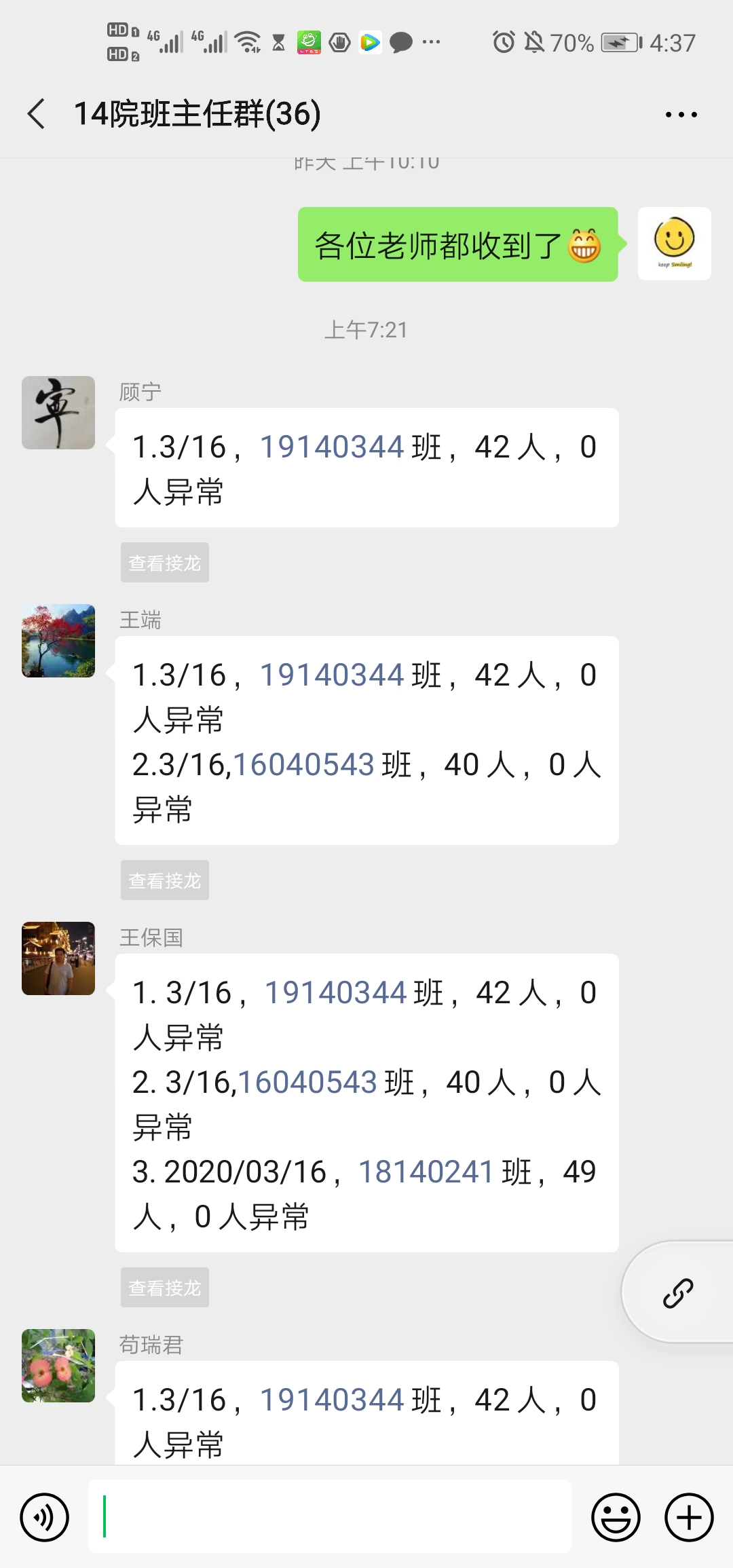 疫情防控期间学生外出情况登记表》、《学生危险接触暴露情况登记表》、《学生疫情防控情况汇总表》等表格的填报工作。严格落实日日上报学生情况,亚洲博彩平台排名共1471名学生,目前无一人出现高热、咳嗽新冠肺炎症状。依托网络教育管理平台,亚洲博彩平台排名辅导员一直在路上,疫情期间学生教育管理工作正有条不紊地进行中。