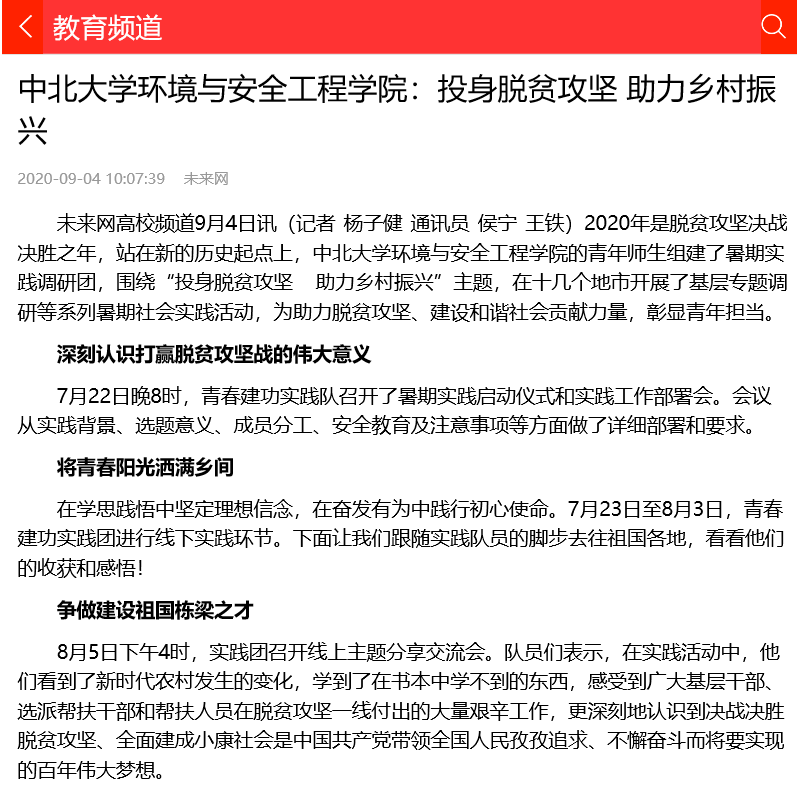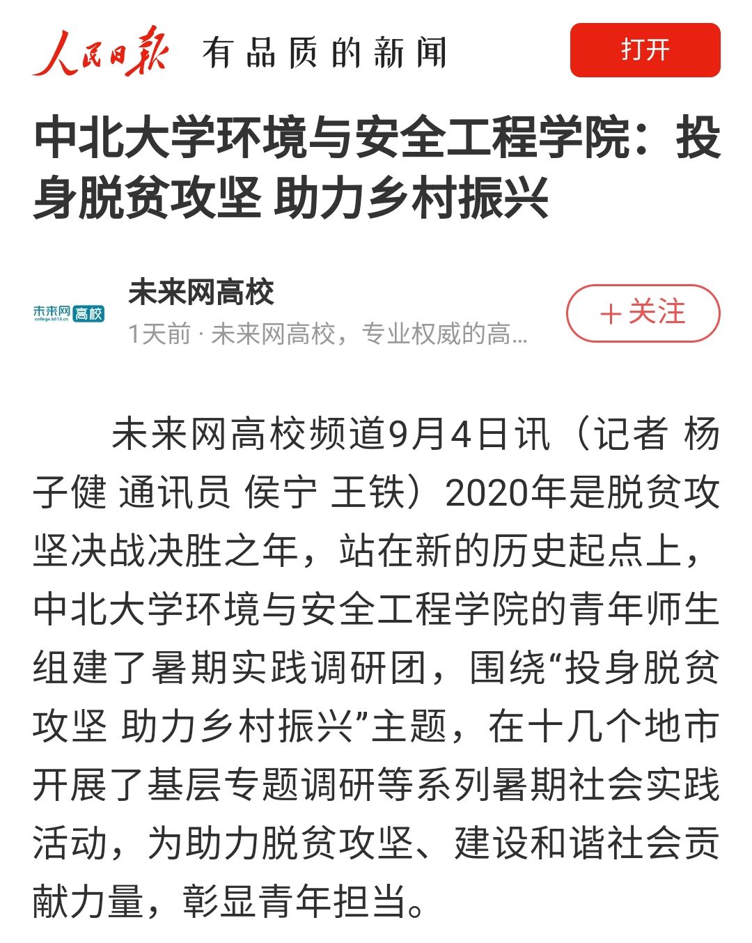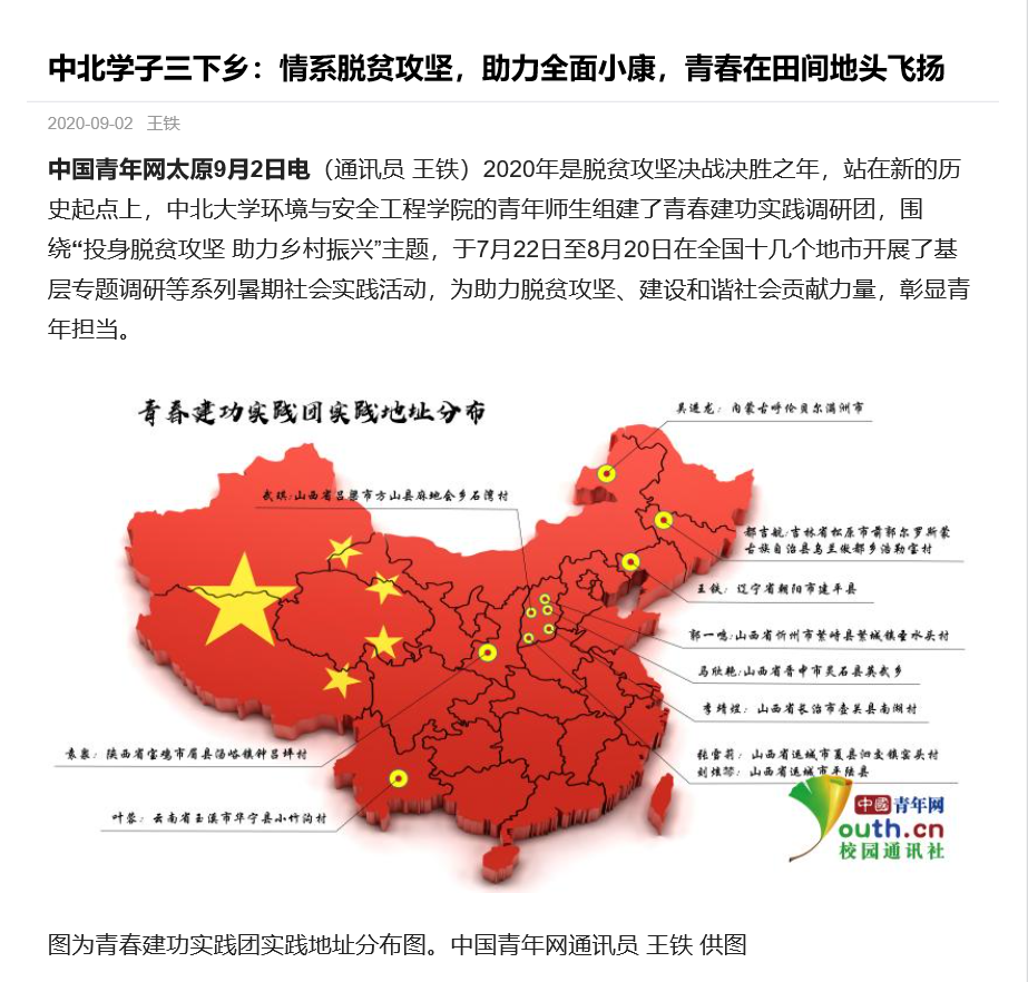 9月2日,《中国青年网》以《中北学子三下乡:情系脱贫攻坚,助力全面小康,青春在田间地头飞扬》为题,对此进行了报道。同时,人民日报新媒体平台、未来网、今日头条、山西青年报、亚洲博彩平台排名