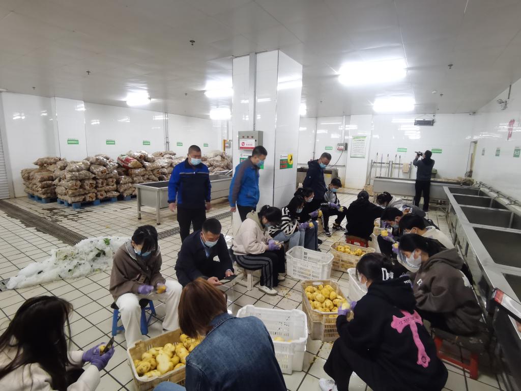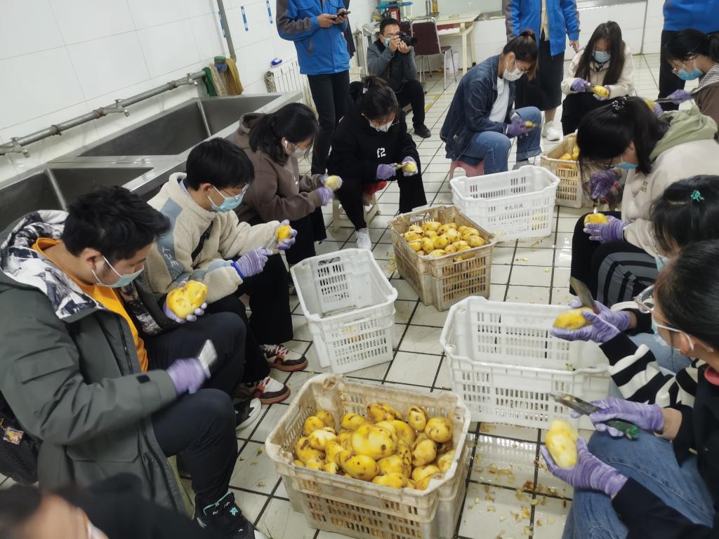 随后,学生们来到蔬菜加工间,在做好安全防护的前提下,参加了土豆加工过程,体验了物流配送中心员工日常的工作劳动。学生们纷纷表示“体验过程很有趣,同时也感受到劳动的艰苦,在今后的大学生活里努力做到节约粮食,并会主动做好节粮宣传”。