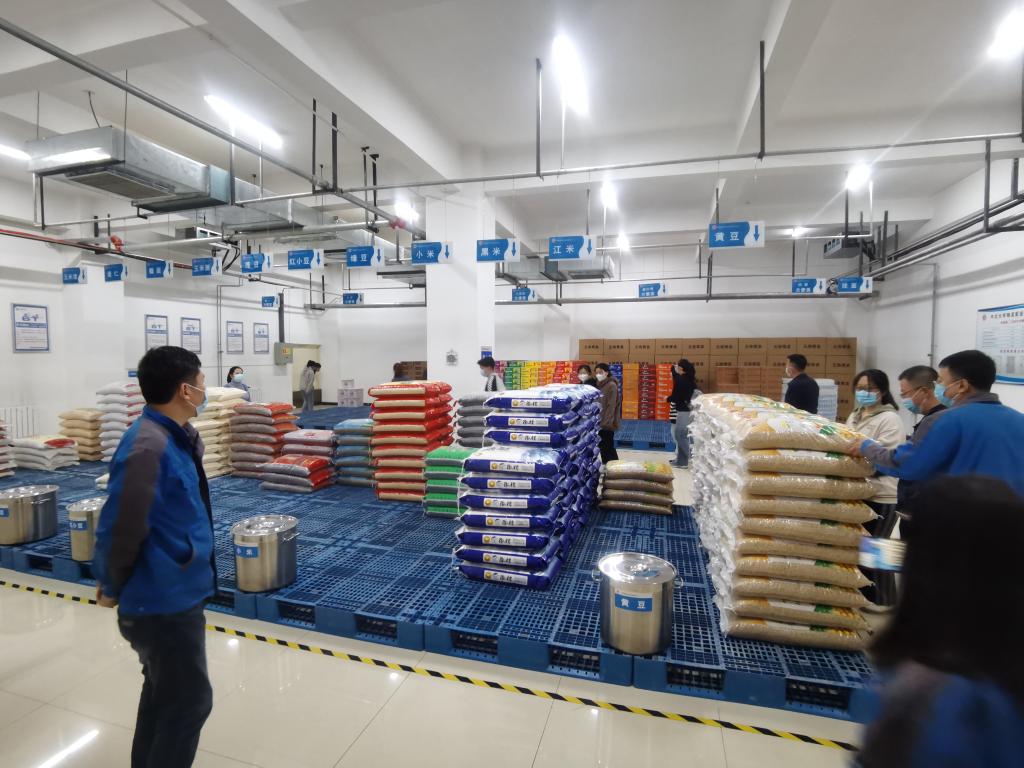 后勤管理部物流配送中心主任苗亮带领学生参观了主食库、杂粮库、副食库等库房。通过实地查看和专人介绍,学生们对学校采购食材的质量和储备数量都有了深入的了解。学校采购的均是高性价比的食材,诸如中粮品牌的大米、好面缘品牌的面粉、天下五谷品牌的食用油、老干妈品牌的辣椒酱、王致和品牌的豆腐乳等等,参观过后同学们对食材的安全性和储备量都充满了信心。