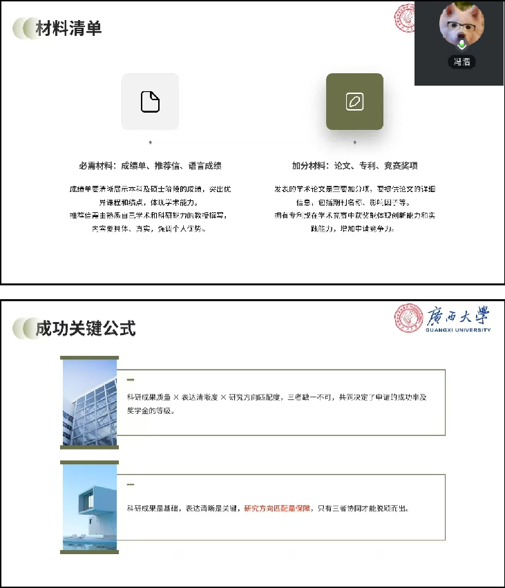 于2025年3月12日两点半举办线上“解码申博密钥,启航学术新篇”经验分享会。分享会邀请了陈冲、李鑫、冯景、冯浩、杨博谦等五位同学担任主讲人。