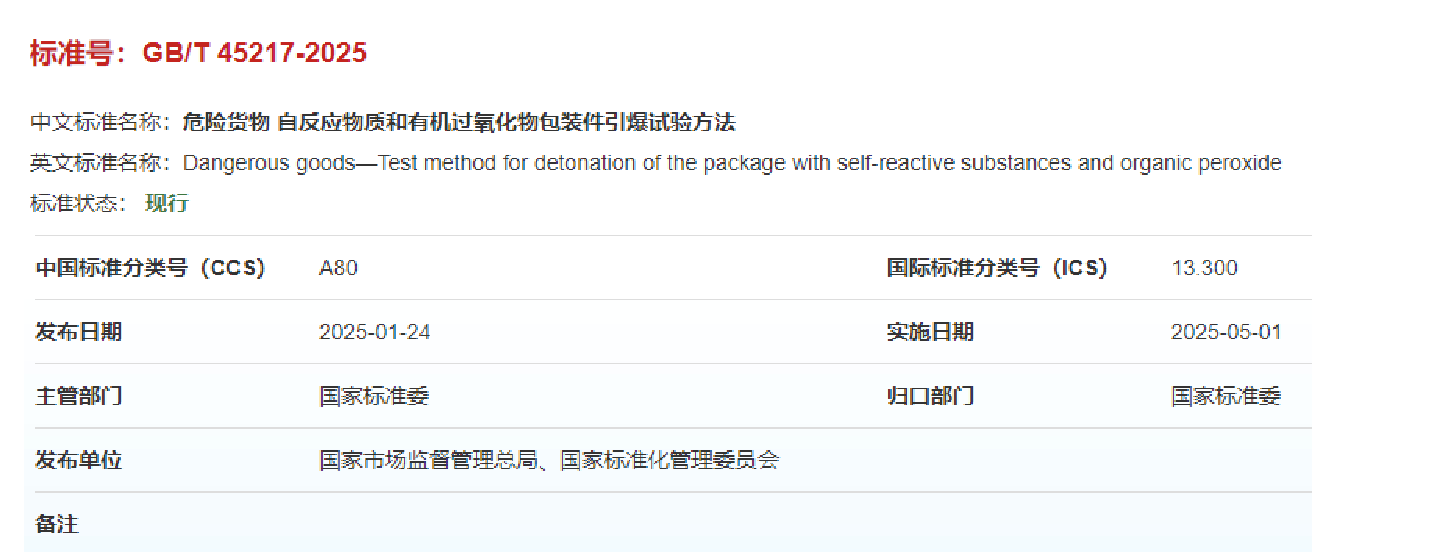 2025年5月,国家标准(编号:GB/T 45217-2025)《危险货物 自反应物质和有机过氧化物包装件引爆试验方法》正式批准发布。该标准于2022年下达了标准制定计划(计划号为20221514-T-469),由亚洲博彩平台排名安全科学与工程学科曹卫国教授团队牵头,联合南京理工大学、安徽理工大学等多家高校以及应急管理部化学品登记中心等行业优势单位历时2年多完成。标准引领,赋能安全科学与工程学科在危险化学品产业高质量发展,助力我校“双一流”建设。该成果是我校安全学科成立40年来牵头起草的首个“GB开头”国家标准,也是我校近8年唯一1项牵头起草的国家标准。
